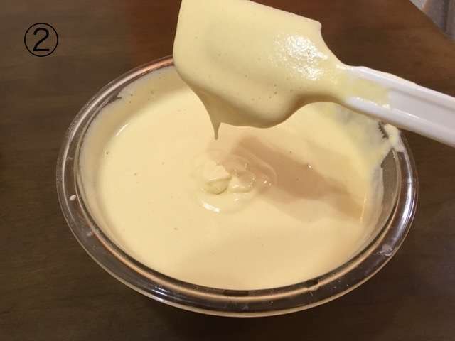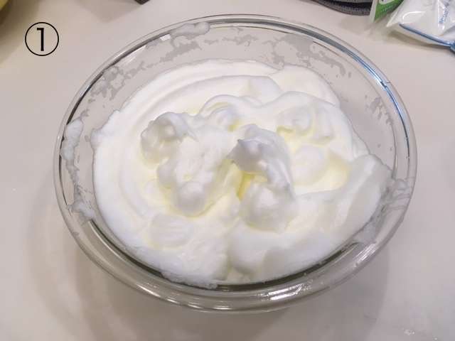 少し固まってきたら混ぜながらグラニュー糖半分を数回に別けて入れていき、写真①のようなツノが立つくらい混ぜましょう。